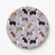 Cute Australian Shepherds / Aussie dogs in black, brown and merle coats sit and stand scattered dog bones and paw prints on a light purple