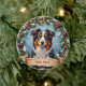 A beautiful, ultra-detailed Christmas ornament design featuring a realistic portrait of the breed centered within a soft, festive winter frame. This elegant design includes pine branches, red berries, and snowflakes against a snowy backdrop, illuminated by warm holiday lighting. The balanced, round composition includes clear space below the dog for customization.