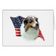 USA! America! Shout your pride with this awesome flag Patriotic background with this AKC dog breed Australian Shepherd in the forefront. Show your pride with this design on a t-shirt, mug, and much, much more!
