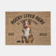 Australian Shepherd Personalised Dog lover welcome doormat. This welcome mat can be personalised with your dog’s name, the slogan can also be changed or you could use a picture of your own dog (make sure it's transparent). Text reads: Rocky lives here…. All treats welcome