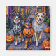 Adorable Australian Shepherds dressed in playful Halloween costumes carry pumpkin buckets while trick-or-treating under the moonlit sky. This festive design highlights the breed’s fluffy coat, intelligent eyes, and playful personality, perfectly capturing the spooky yet fun atmosphere of Halloween night. A delightful celebration for dog lovers and Halloween fans alike.
