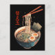 This design features a deliciously detailed illustration of a traditional ramen bowl, complete with noodles, eggs, and various toppings. The chopsticks are lifting some noodles, adding a dynamic feel to the image. Japanese characters add an authentic touch
