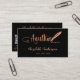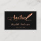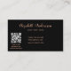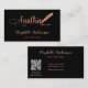 An elegant business card on a black background and a rose gold feather pen. Elegant hand lettered style script. Personalise and add Your name, title, contact info and your own QR code to your website address.
