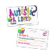 Autism awareness badges with contact information, featuring custom options for names, emergency numbers, and medical info. These help ensure safety and understanding in public.
