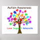 Beautiful and unique autism tree with autism puzzles, butterflies, hearts, and “Love Support Advocate” to support Autism Awareness.