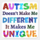 Inspirational quote of “AUTISM Doesn't Make Me DIFFERENT, It Makes Me UNIQUE” with colourful Autism puzzles to support and advocate Autism Awareness.