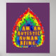 "I am an autistic human being" in orange text against a mosaic rainbow flame and a dark blue background.