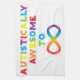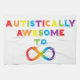 Design made with love for Autism Awareness. Rainbow letters form the phrase 'Autistically Awesome To Infinity' with an infinity symbol.