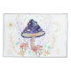 This is an autumnal design featuring a stylised mushroom as the central element. The mushroom is depicted with a blue cap and a light-coloured stem, surrounded by foliage in warm, earthy tones. The background is a large, mottled orange circle, giving the entire composition a feeling of warmth and a connection to the season.