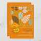 A bright and happy autumn-leaf invitation featuring leaves in white, blue, yellow, green and brown against an orange background. (Vecteezy.com - Fall and Autumn Card Vector Templates by happymeluv). The card is easy to customise with your wording, font, font colour, paper shape options and choice of six paper types.