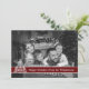 A modern photo Christmas card design with your family photo filling the card face and automatically converted to black and white. Fun modern art Christmas tree decor with dark red text band for your words.