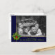 Personalise the front and back of this fun photo Christmas postcard. Your family photo filling the card face behind a blue and gold frame highlighted with a pine and holly bough. Bottom band holds your names and Christmas greeting in a soft green font. You can personalise the backside holiday greeting, your return address and your names in script near the bottom with space for you to add a handwritten personal note.