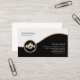 This auto mechanic business card features black and white segments separated by a wavy gold strip. An elegant gold icon of a car engine lies on the lower left side of the design, that's generally suitable for businesses or professions related to transport, transportation, haulage, cargo, truck, lorry, car, automotive, mechanic, car repair themes.