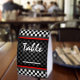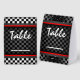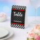 Auto Racing Checkered Design Tent-Style Paper Table Sign with customizable text on both sides. Fill in your own Table Numbers. Note: Each order consists of 10 identical signs, thus, fill in your own table numbers.