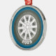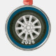 Photograph of automobile wheel on green background. with date printed on the bottom of the tire.