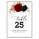 This beautiful table number features a vibrant floral arrangement with rich burgundy roses, deep emerald green accents, and delicate gold accents. The number is prominently displayed in a bold, modern font, making it easy to read from a distance. The couple's names and the wedding date are also included at the bottom. This table number is perfect for an autumn wedding with elegance and sophistication.