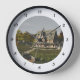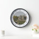 This round clock features an original digital artwork by Jayne Wilson, depicting an large lakeside cottage surrounded by trees in their fall foliage, with a pathway leading to a boat at the water's edge.