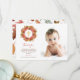 This autumn Baptism thank you card features a stylish wreath made up of red, brown, and gold fall leaves and a coordinating fall leaf pattern on the back. There is a faux gold cross in the centre of this gender neutral card, and a place for your baby's photo.