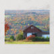 This is a postcard of a picturesque red and white barn with rolling hills as far as the eye can see. Gorgeous autumn colours of red, yellow, orange, gold and green are in the foreground and paint the surrounding hillsides.