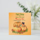 Fall scene with orange pumpkins resting on leaves. Sunflower accent and sweet black cat peeking out at you. Adorable invitation theme for Autumn Harvest festivities. Text is ready for you to customise.