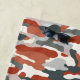 This beach towel has a vibrant camouflage print featuring rich Tuscan red contrasting with cool grey tones in a pattern reminiscent of rocky desert terrain.