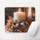 A white candle is surrounded by autumn pine cones, acorns, and colourful leaves
