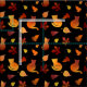 A pattern of silhouette ginger cats and Autumn leaves in burnt orange, yellow and red, on a black background. A great design for a cat mum who loves to sew.