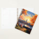 This planner features a vibrant illustration of a light yellow sun rising above a city in autumn. Bright orange and umber trees line the waterfront. A dirt path stretches past a street light to the water. The design is the same on the front and back covers. Personalise the front with the current year.