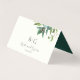 Lush watercolor foliage and roses have touches of golden foliage. Monograms, names and date on reverse with matching greenery accent. This version has deep grey lettering.