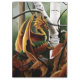 A cute terra cotta and green coloured small dragon sitting amongst autumn leaves and poplar trees