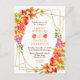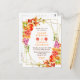 This fun and whimsical wedding postcard features watercolor pomegranate, apples, grapes, mushrooms and foliage on a gold geometric frame. The text combines handwritten script and serif fonts for a stylish and modern look. This is perfect for a rustic autumn fall wedding.
