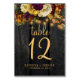 Rustic country elegant wedding table number with editable text featuring fall botanicals and a chic script on a dark brown barn wood background with string lights. Ideal for your summer or autumn fall garden backyard outdoor or farmhouse wedding.