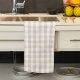 This design features a fall autumn, simple farmhouse kitchen towel, rustic country, minimalist harvest, stylish elegant, holiday dinner, buffalo check, minimal pattern, tan brown white, tartan style.