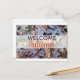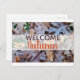 Welcome autumn postcard with a beautiful picture of fallen leaves with tiny yellow mushrooms.