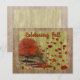 Express your sentiment with this gorgeous rustic Autumn scenery on a warn stone background. Green, yellow, orange, rust, and red leaves blowing threw the air from the distant trees. Wonderful card for American and Canadian Thanksgiving Holidays. Thanksgiving Falling Leaves Landscape.