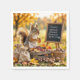 A charming scene depicts a squirrel in a small apron, seated next to a wooden crate overflowing with various nuts and berries, while a nearby chalkboard displays nut prices, creating a whimsical market atmosphere
