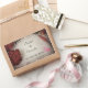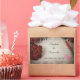 A wedding favour, sticker which you can customise with the bride and grooms name and wedding date. An autumn floral themed photograph. Faded lined writing paper and some pretty red flowers and green leaves placed around the edges.