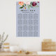 This autumn floral dusty blue seating chart poster is perfect for a fall wedding. The design features a stunning bouquet of blush, orange peach, and marsala burgundy flowers with pewter gray typography. This wedding poster includes enough room for up to 16 tables (160 guests). In addition to the placement of each guest, personalize this sign with the names of the bride and groom and the wedding date. This seating chart can be used for a wedding reception or any special event.