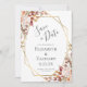 This elegant floral fall wedding save the date card features a gold geometric frame decorated with rust and peach floral bouquets on a white background. The customisable text combines charcoal grey whimsical handwriting, copperplate and italic fonts. The reverse side is solid white. Ideal for a romantic autumn wedding!