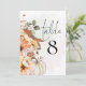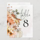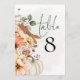 Autumn Floral Pumpkin Table Number. A beautiful autumnal botanical border along the left hand side and the table number which you can easily personalise. The same design is on the other side. With a soft pastel background watercolor wash.