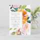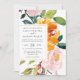 An elegant fall wedding invitation with autumn floral in fall colours. The autumn watercolor floral wedding invite features a large floral bouquet of gold and blush pink roses. The unique design places the wedding details along the left side of the invitation. Personalise the rustic invitation using the template provided. Matching RSVPs and other wedding stationery in our "Autumn Elegance" wedding collection.