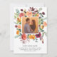 A fall-theme save the date with a beautiful floral frame. The photo save the date features watercolor flowers, including roses, buttercups, and dahlias, in pretty autumn shades of marsala, mustard yellow, peach, and plum. The watercolor floral arrangement frames your favourite photo.