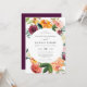 This elegant fall-theme wedding invitation features a circular floral frame with pretty watercolor flowers. The watercolor floral includes roses in shades of blush, burgundy, peach, and golden yellow. Violets, maroon mums, and lush green foliage also adorn the floral frame. Personalise the wedding invite using the template. Matching RSVPs and other wedding stationery in our "Autumn Elegance" collection.