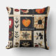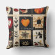 This throw pillow features a folk art patchwork quilt style, arranged in a grid of autumnal and nature-inspired motifs. Prominent elements include orange pumpkins, stylised flowers, vine patterns, a red heart with cream outline, and a polka-dotted bird, all set within contrasting blocks of black, cream, and warm earthy tones like orange, red, and brown. The varied textures suggest appliqué, embroidery, or traditional quilting techniques, giving the design a homespun, handcrafted feel. Perfect for fall décor, rustic farmhouse style, Thanksgiving crafts, and primitive folk art lovers, this pattern blends cosy charm with seasonal elegance.