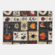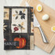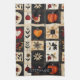 This kitchen towel features a folk art patchwork quilt style, arranged in a grid of autumnal and nature-inspired motifs. Prominent elements include orange pumpkins, stylised flowers, vine patterns, a red heart with cream outline, and a polka-dotted bird, all set within contrasting blocks of black, cream, and warm earthy tones like orange, red, and brown. The varied textures suggest appliqué, embroidery, or traditional quilting techniques, giving the design a homespun, handcrafted feel. Perfect for fall décor, rustic farmhouse style, Thanksgiving crafts, and primitive folk art lovers, this pattern blends cosy charm with seasonal elegance.