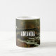 A mug with a nature photograph. Moody and beautiful landscape. A secluded stone bridge beside a lively river with a forest and mountains surrounding the area.