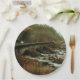 Paper plates with a nature photograph. Moody and beautiful landscape. A secluded stone bridge beside a lively river with a forest and mountains surrounding the area.