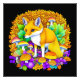 Brightly coloured artwork with mushrooms and fall leaves and a blue-eyes fox in the centre.