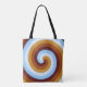 This image is a vibrant, psychedelic spiral design made up of thick, colourful bands that swirl from the centre outward. The colours—yellow, orange, magenta, green, and dark purple—alternate in a repeating, hypnotic pattern, evoking a retro or pop-art aesthetic. The strong contrast and symmetry create a feeling of energy and movement, making it visually striking