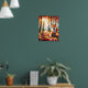 A warm-coloured portrait featuring oranges, reds, yellows, and browns, with the sun shining through the trees.